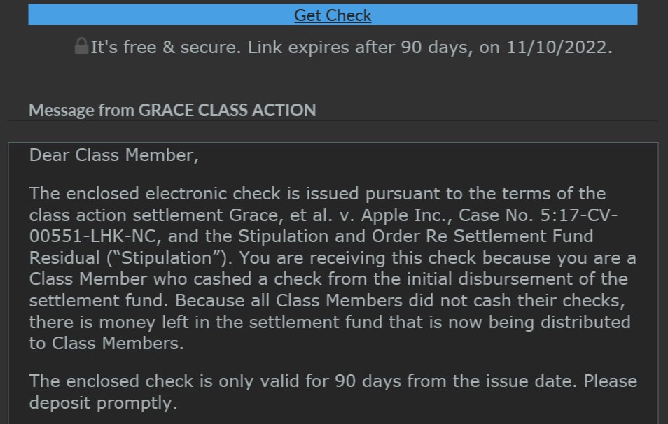 Apple Settlement Administrator PO. This is where you can find out what class action settlement checks have been mailed in 2022. There are interesting things that we found namely that many iPhone users actually expect that the e-check presented by Grace Class Action is a fraud this is because.